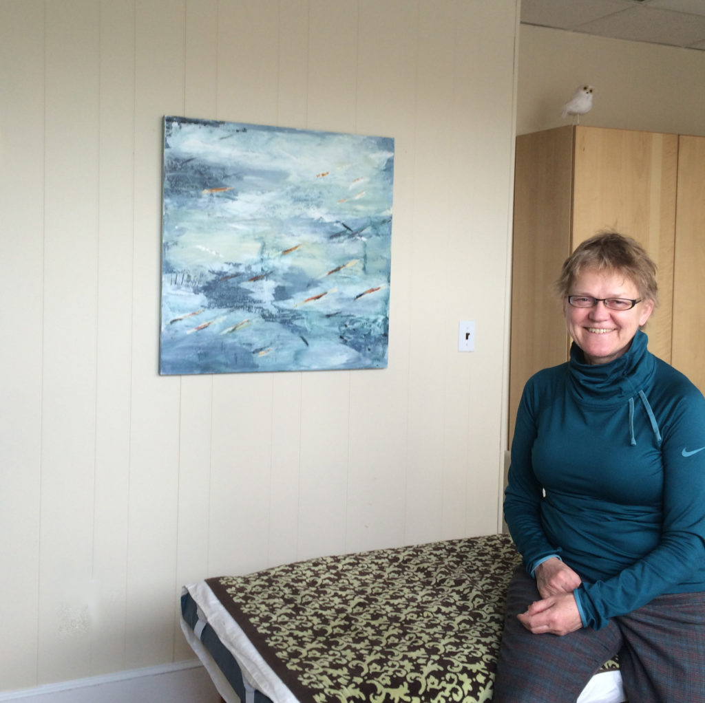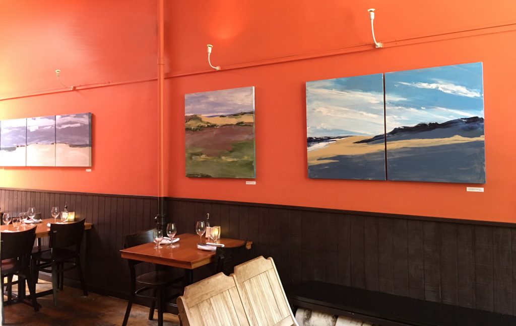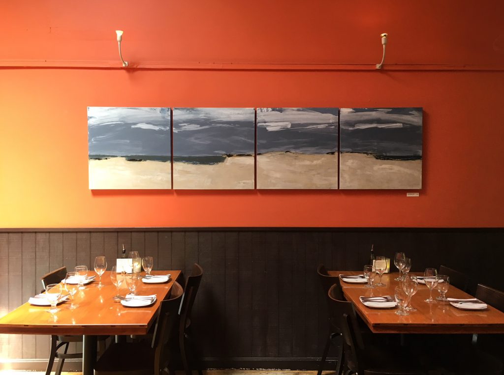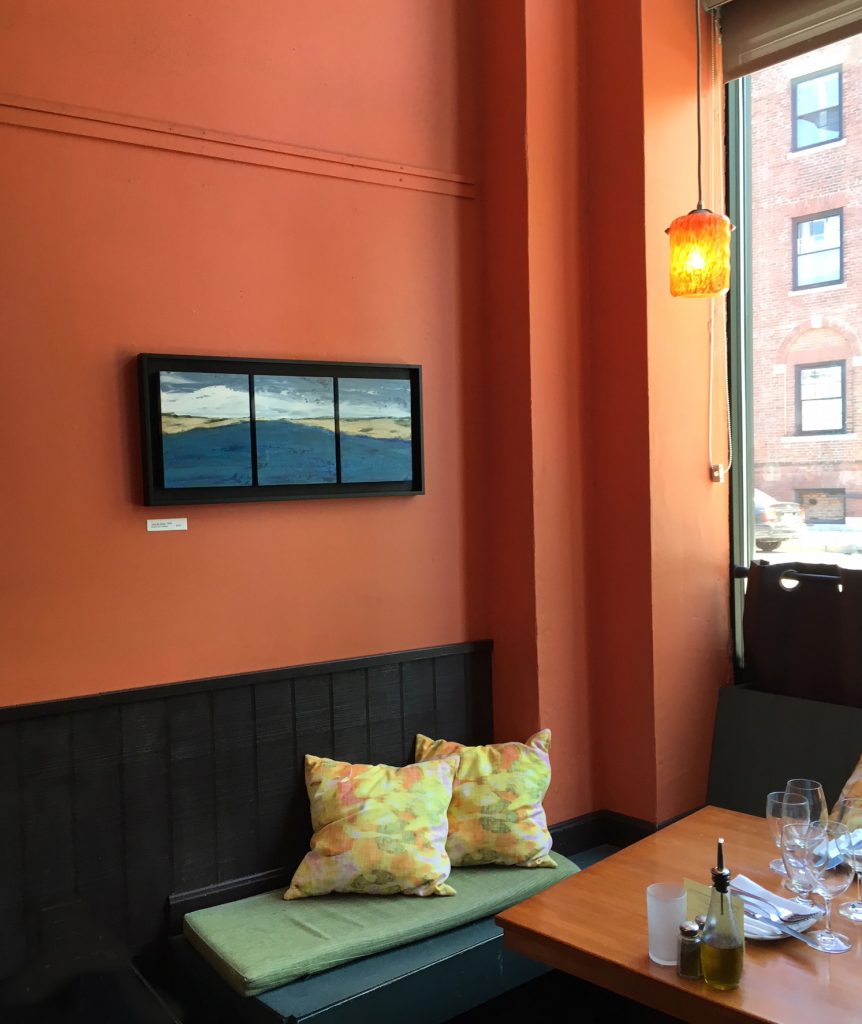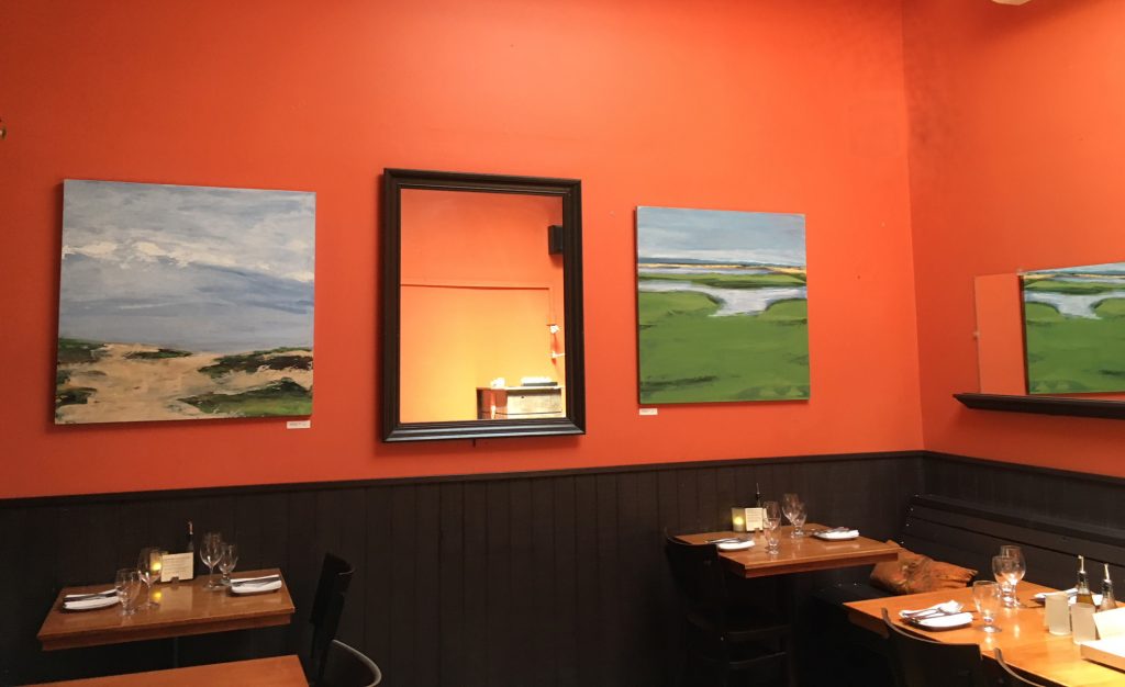 Summer Show 2018 “Beach Scene” paintings at restaurant Vee Vee (veeveejp.com) in Jamaica Plain, MA.