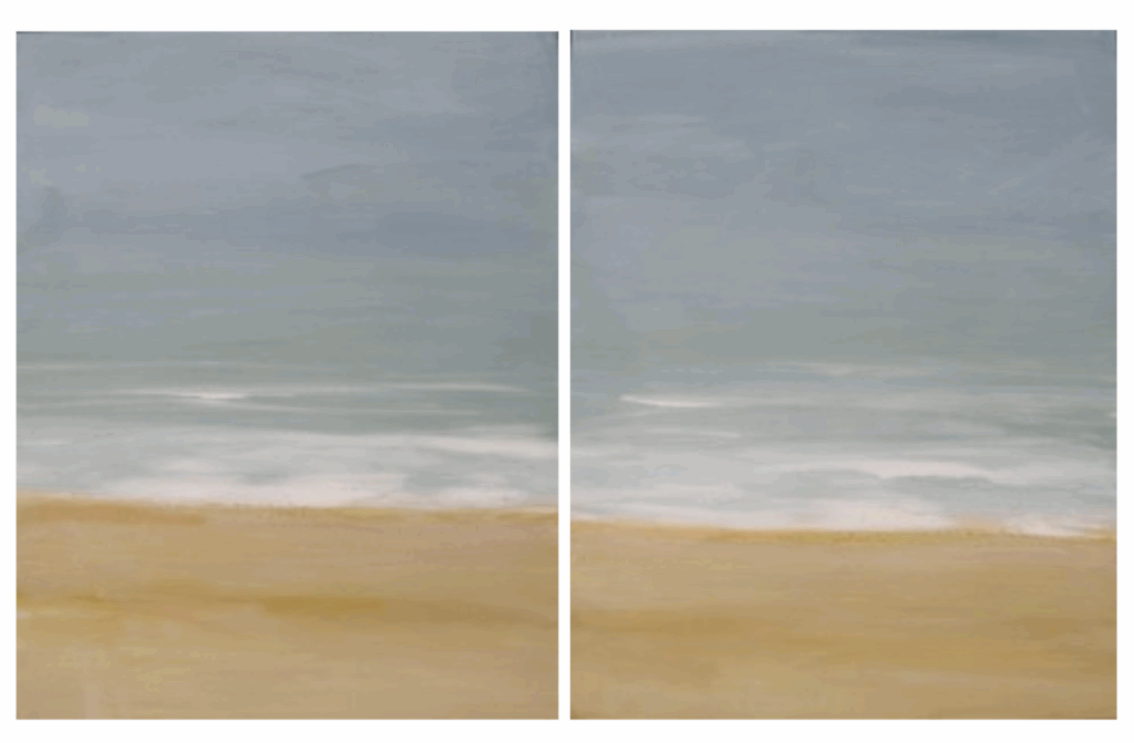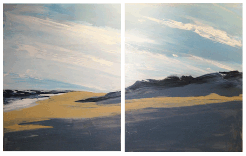 Late Day Shadows over Dunes,   2009  30 x 48″ , overall, 2 parts, acrylic on panels